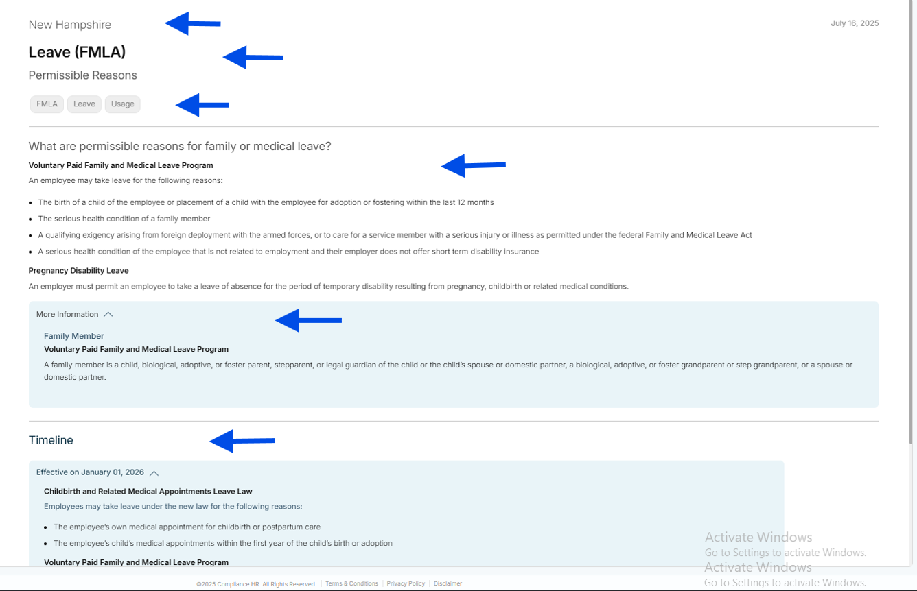 It consists of the jurisdiction, the topic, applicable tags, answers to the topic question, a more information section (when relevant) that contains helpful text related to the topic, and a timeline that indicates when the current content was updated and if future changes are known with the upcoming effective date.