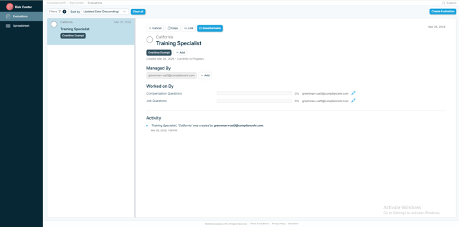 unique link to this specific evaluation that allows the Manager to share it and a button to access the Questionnaire. You'll also find the Jurisdiction and the Subject being evaluated. In the example below, the Work State was California and the Subject is Training Specialist.