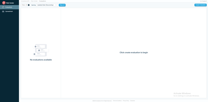 Within the left hand rail, you will find two main components that organize the content within the Risk Center, Evaluations and Spreadsheet. Prior to creating new evaluations each component will appear empty. The Evaluation component serves as the default view when a user accesses the Risk Center.