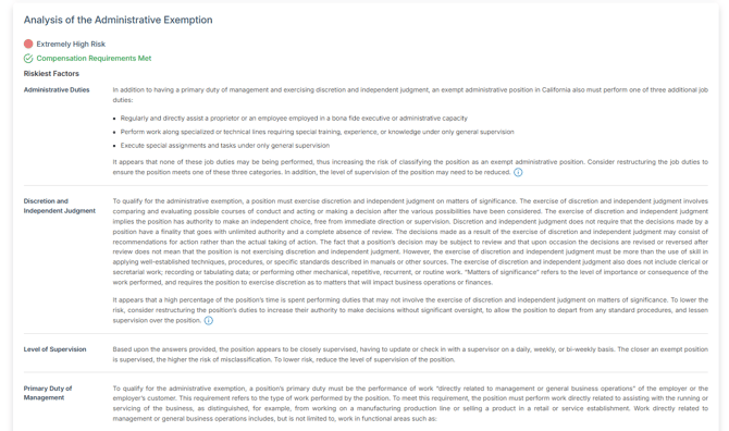 As you scroll down you'll see the analysis for each individual exemption. If the position failed to qualify, we will start by sharing information on the law related to the the riskiest factor and then how it applies to your specific fact pattern entered.
